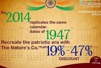 15th of August 2014 marking the same day as in the Independence year of 1947, The Nature's Co. attempts to get back those days of patriotism and celebrates the spirit of freedom by offering a rebate of 19% - 47% on their vast range of natural bath and body care products.