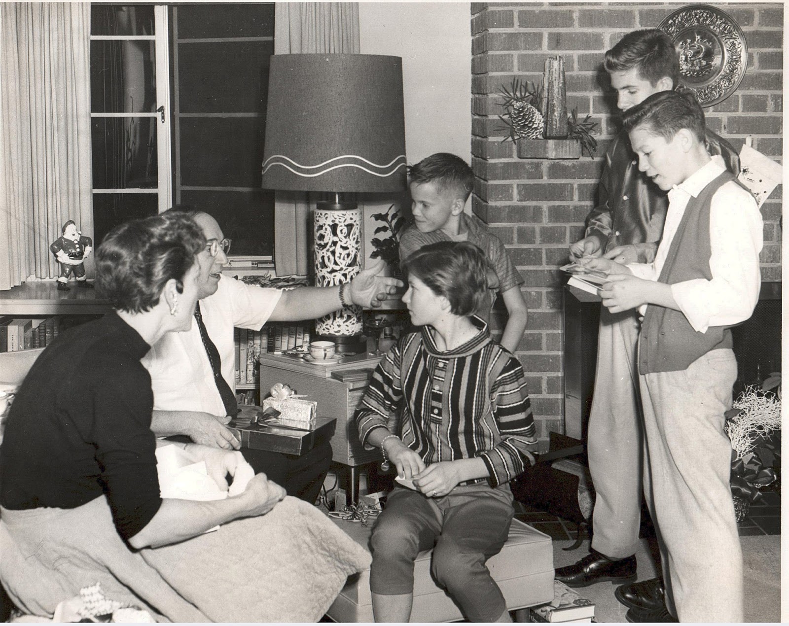 1960s. Uncle Emery at Christmas handing gifts. Floyd and Jeff Welles right hand side of picture.
