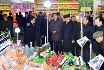 DPRK Premier Choe Yong Rim (foreground, R) tours an exhibition of light industry goods at the Three Revolutions Exhibition in Pyongyang (Photo: KCNA)
