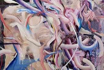 After inexplicably disappearing for several years following his initial success, he now returns with a new series of large canvases characterized by skilfully rendered figures with dynamic, sweeping brushstrokes, a gestural yet painterly application and frantic scrawlings. Delving further into abstraction, Charlie introduces a new element in his work: large photographic prints are the backdrops for recurrent themes of flesh, sexual acts, depravity and decadence.