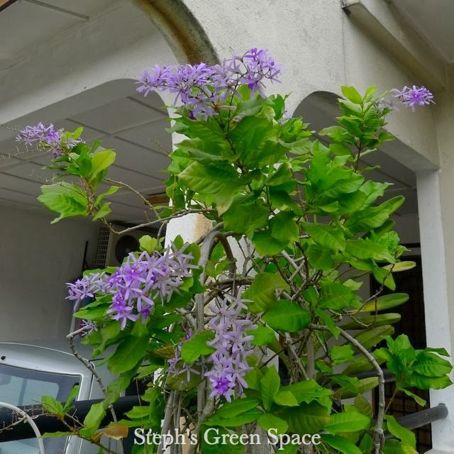 When everything seems gloomy (it has been raining daily!) and not many plants are in bloom, my Petrea volubilis, commonly known as Sandpaper Vine or Queen's Wreath, produces racemes of purple flowers to perk up the garden. What a pleasant surprise :-)