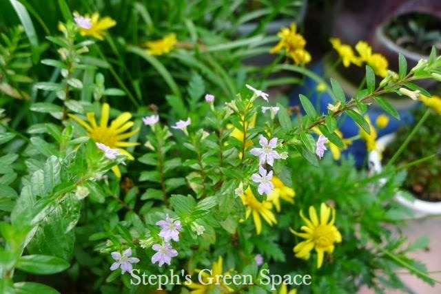 I think light purple flowers are generally outstanding. The other plant that blossoms purple flowers is Cuphea hyssopifolia. Though the blooms are small, they do stand out against the dense bush with tiny green leaves.