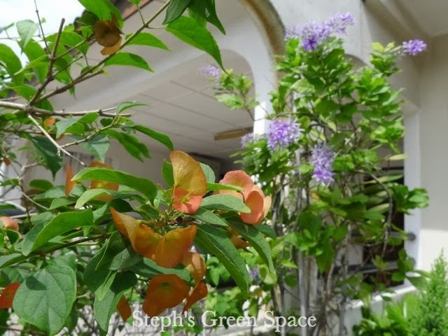 The vine is a native to West Indies and regions from Mexico to Panama. Its sprays of purple blooms looks somewhat like orchid to me whereas the leaves reminds me of guava leaves, haha... What do you think? And do you like the colours?