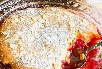 Spoon the cake batter over top, trying as best as you can to cover all of the cherry filling. Sprinkle a handful of almonds over top.Bake in the preheated oven for 35 to 40 minutes, until the cake springs back when lightly touched and a toothpick inserted in the center comes out clean, with no wet batter attached. If you need to you can bake for a bit longer.If it is browning too quickly you can cover lightly with aluminum foil.Serve warm spooned out with a scoop of vanilla ice cream on top or with lashings of cream or custard. Delicious!