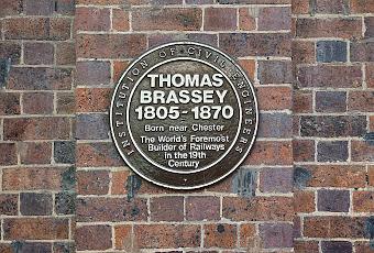 Brassey was born just outside Chester, the son of a farmer, and educated in the city. He began as a land surveyor, quickly becoming a partner of the firm in which he apprenticed and expanding it into building materials. He established a factory and major brickworks in Birkenhead. On George Stephenson's advice, he expanded his activities into railway building, starting with the Penkridge Viaduct in Staffordshire in 1835. The advice proved more than sound: other tenders followed and in 1841, Brassey won contracts in France as well. (Not entirely successfully: the Barentin Viaduct collapsed in 1846, although its replacement - which he built at his own expense - is still standing!)