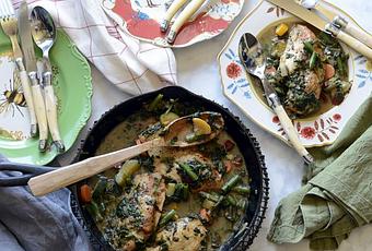 That's why I love creating fabulously delicious recipes that use ingredients that you can find just about anywhere and cook something up in no time at all. This 'Chicken in Onion Wine Sauce with Farm Vegetables' is something that will fly out of the skillet when you serve it. And, if you have leftovers, it's going to be better on day two. You're going to have this dish in your oven in about 10 minutes. Then you just go about your merry way, do some laundry, answer emails, run and pick up the kids at tee ball practice, and when you come home, the house will smell like Grandma's broken in and is hijacking your kitchen!