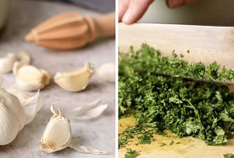 Food prep shots of fresh garlic and fresh parsley and coriander