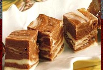 Pour one-third of the white mixture into pan, spreading evenly. Quickly pour one-third of the chocolate mixture over top, spreading evenly. Repeat twice. Swirl knife greased with butter through mixtures for marbled design. Cool until set.