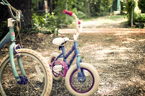 Pre-school age: Below 16 inch wheels 4-6 year olds: 16 inch wheels 6-10 year olds: 20 inch wheels 9-12 year olds: 24 inch wheels 12 years and above: A smaller-sized adult bike should do the trick. Remember that this is not set in stone, and you will need to take into account your child’s individual size and requirements. Big Brakes Brake levers don't really need to be made smaller for kids. Instead you could opt for a two-fingered adult lever that is placed close enough to the handle-bars for a child to reach it. Test this out before buying or ensure that the brakes have an adjustment screw for easy modification. A quick adult test of kids bikes is by seeing if you can use the brakes with only the little finger on each hand. If unsure about a bike you’re thinking of buying, check with an in-store assistant or look up online reviews and parent forums to determine whether it’s right for your child. Taking the stabilisers off the bike is a moment heavy with metaphor. It symbolises a milestone for parents (letting go of the reins) and children (look mum, no hands!). So long as you’ve done your research and are happy that you’ve chosen the best bike for your child, that moment will be one you’ll remember for a lifetime. Image by John Tornow, used under Creative Comms license