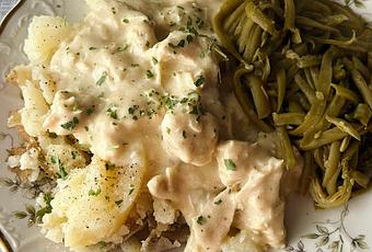 - Serve hot and ladled over top of potatoes, noodles or rice.