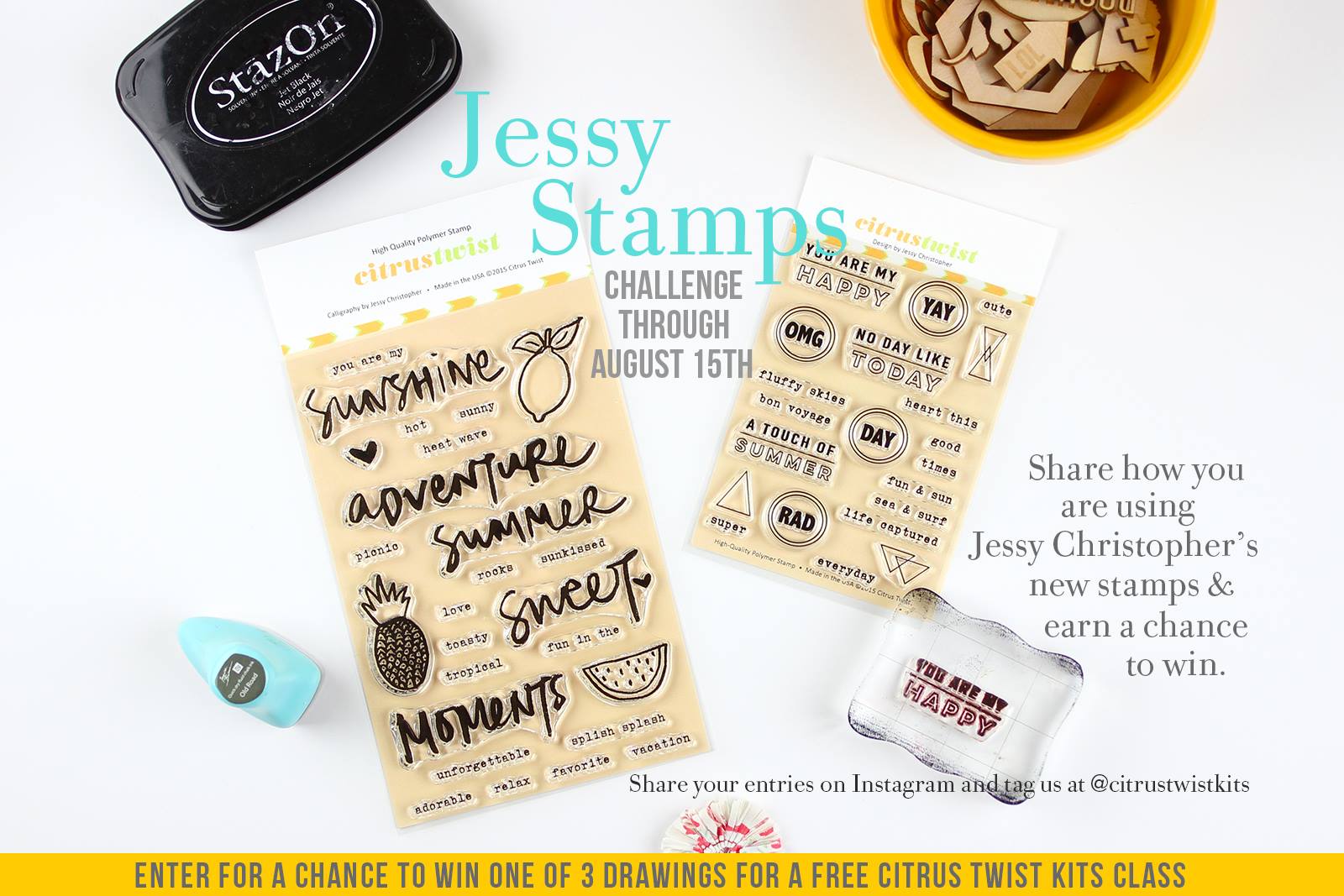 The challenge to you is to use one (or more) of my new stamps sets and share how you used it (them). Take a photo of your finished project, post to Instagram and tag us at @citrustwistkits and hashtag #juststampit. If you don't have an Instagram account, you can always share your project here: CTK Fan Page at Facebook. Entries are due by August 15th.