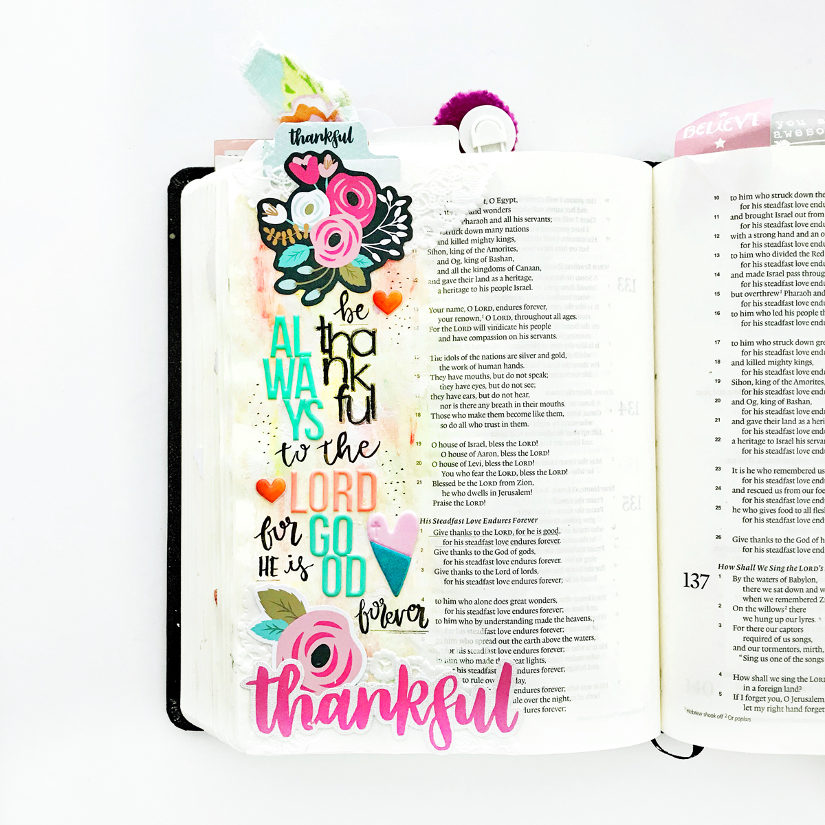 I knew I had to create a page all about give thanks! I've been blessed with many great things and showing my gratitude in my journaling bible is something I enjoyed doing! Thank you so much for coming by! Hope you are inspired to pull your GraceBox and create! Having time alone with God is always refreshing :)Xoxo Jessy