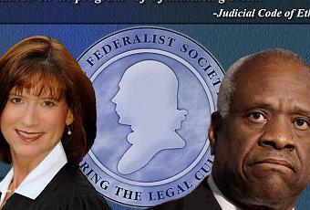 Fortunately, someone is finally calling these judges on their ethical violation. Rep Louise Slaughter (D-New York) and Common Cause have sent a letter of complaint to Chief Justice Roberts (regarding Thomas' ethical lapse) and filed a formal ethics complaint about Judge Sykes (regarding her ethical violation in appearing at the event). Arn Pearson of Common Cause says: