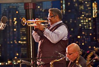 Actually it’s an outdoor concert. That’s Manhattan in the background. The trumpet player is well-known. Do you recognize him?