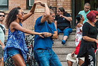 Ah, that makes perfect sense! The Hoboken Art and Music Festival provides the perfect context for this lively street dancing scene. The dancers are really getting into the salsa music, especially the woman in the blue patterned dress who appears to be mid-twirl. The casual, festival atmosphere is evident in how people are dressed and the way some are watching from the steps of what looks like a typical Hoboken brownstone building. These kinds of street festivals really bring communities together, creating spontaneous moments of joy and cultural expression like this dance scene. You can tell from the dancers' energy and body language that the live salsa band must be playing something particularly engaging!