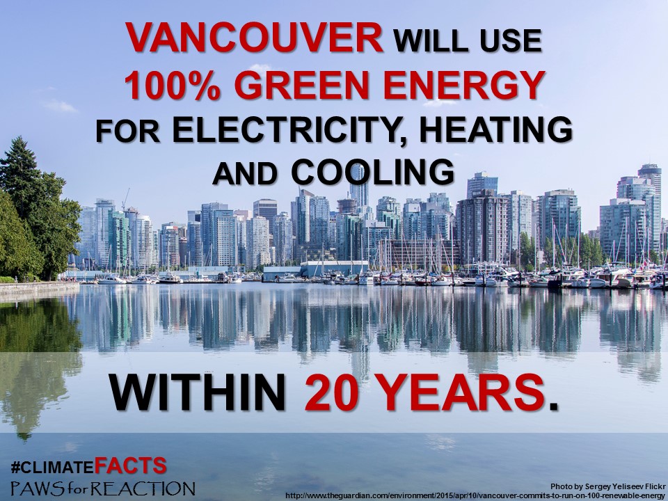 What renewable energy commitments has your city made? Cities and urban areas are responsible for 70-75% of global CO2 emissions. Vancouver is a city of 600,000 people, yet Vancouver is committing to going green, and is encouraging Canada to invest in renewables and become energy independent. Thank you Vancouver! CLICK HERE to learn more about Vancouver's commitment!