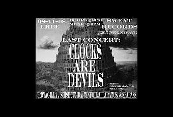 Following the success of the split cd and subsequent tour, Clocks Are Devils immediately began working on new material for a highly anticipated full length and accompanying tour. After writing all the material, Clocks began recording the new record in the fall of 2008 while simultaneously playing local concerts and touring. After finally completing the full length and having the cd mixed by John Nuñez (Torche and Shitstorm) and mastered by Rory Willis (Bears!) Clocks Are Devils began dissolving. There weren't any fights or any arguments, to put it simply other priorities and responsibilities began making getting together difficult. It was eventually decided that Clocks Are Devils would perform for the last time August 11th, 2008 at Sweat Records.