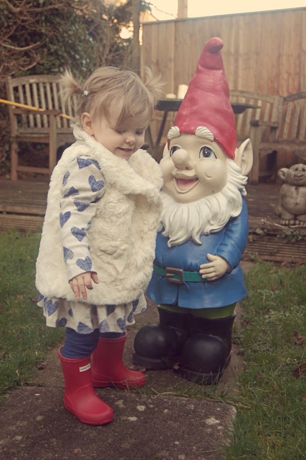 I decided to go for the Hunter Wellies as Abbie has developed a rather strong bond with the puddles at the moment and I wasn't sure how her other boots would hold up against them, so I ordered them in red and waited patiently for them to arrive...I forgot about the gorgeous packaging the adult ones come in so instantly fell in love all over again when unwrapping the parcel to see a miniature version of their famous box, complete with handle and the hunter logo! I have never seen such a cute pair of Wellies in all my life, or shoes for that matter, they were absolutely perfect, from top to toe (excuse the pun), the color was bright and vibrant just like the images on the website too, they were perfect! It took me 10 minutes to get them back from Abbie who had run off with them and was attempting to put them on herself...but we retrieved them and put them on her and headed out to test them!