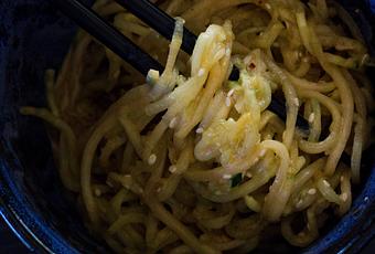 - Use a spiralizer to create a noodle shape, place in a strainer with salt and let sit at least 20 minutes (this helps drain all the water).