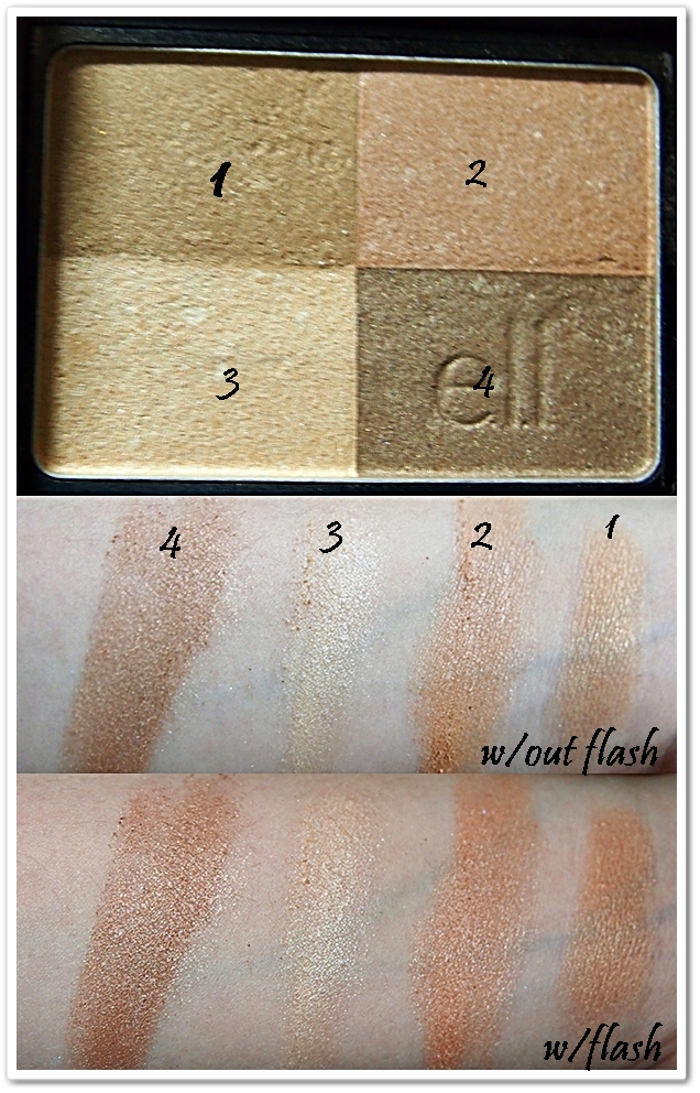 · I bought this at around PHP125 but I saw this only USD1 at ELF site· The is a pretty tiny palette but since all four shades are shimmery I think the amount provided is just adequate· All shades are really pretty especially for brightening purpose as they are quite glowy and sparkling· Ideal use for night events and parties ^_~3) ELF Eyeshadow compact in Natural #11012