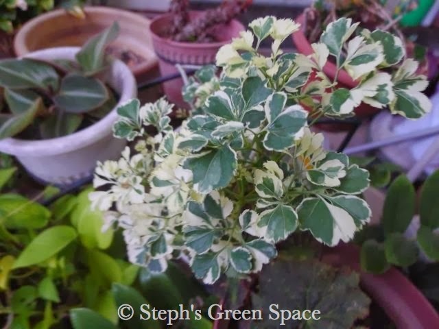 Meanwhile the Polycias 'Dwarf Variegata' stand out in the shade even when the sun is down. Its cream and dark green colours from the variegated leaves are ever attractive!