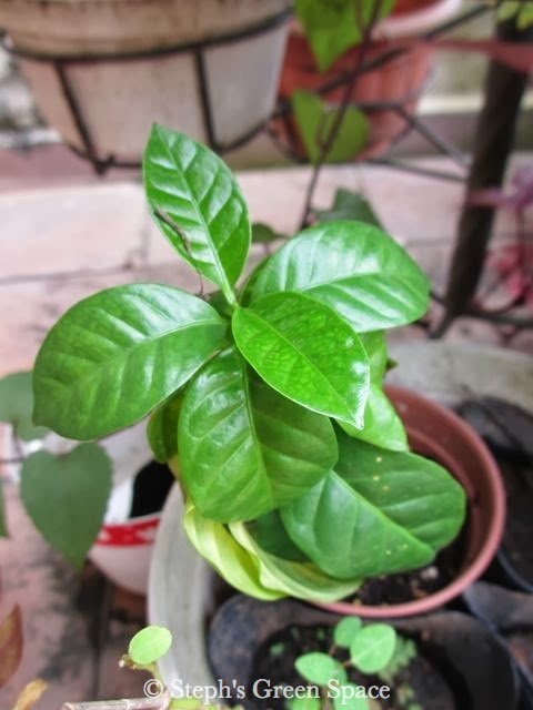 Someone has identified this little coffee plant to be a variety of Coffea liberica! Since I have moved the plant out to have a bit more sun, the leaves are now growing to point upwards and smaller. In any case, I am loving the glossy dark green leaves :-D