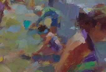So, while I don't often set out to impose a color scheme on my work - I find that to be an artificial process that feels too rational for such an intuitive process - I did make a decision to use a lot of green in this piece. Once I had that, and the color of the foreground figure's bikini top, I wove the purple throughout the rest, letting it work as a foil and near-complement to its surroundings. The warm reds, pinks and peach colours relieve the overall coolness, and I hit them hard in the figures' skin tones.