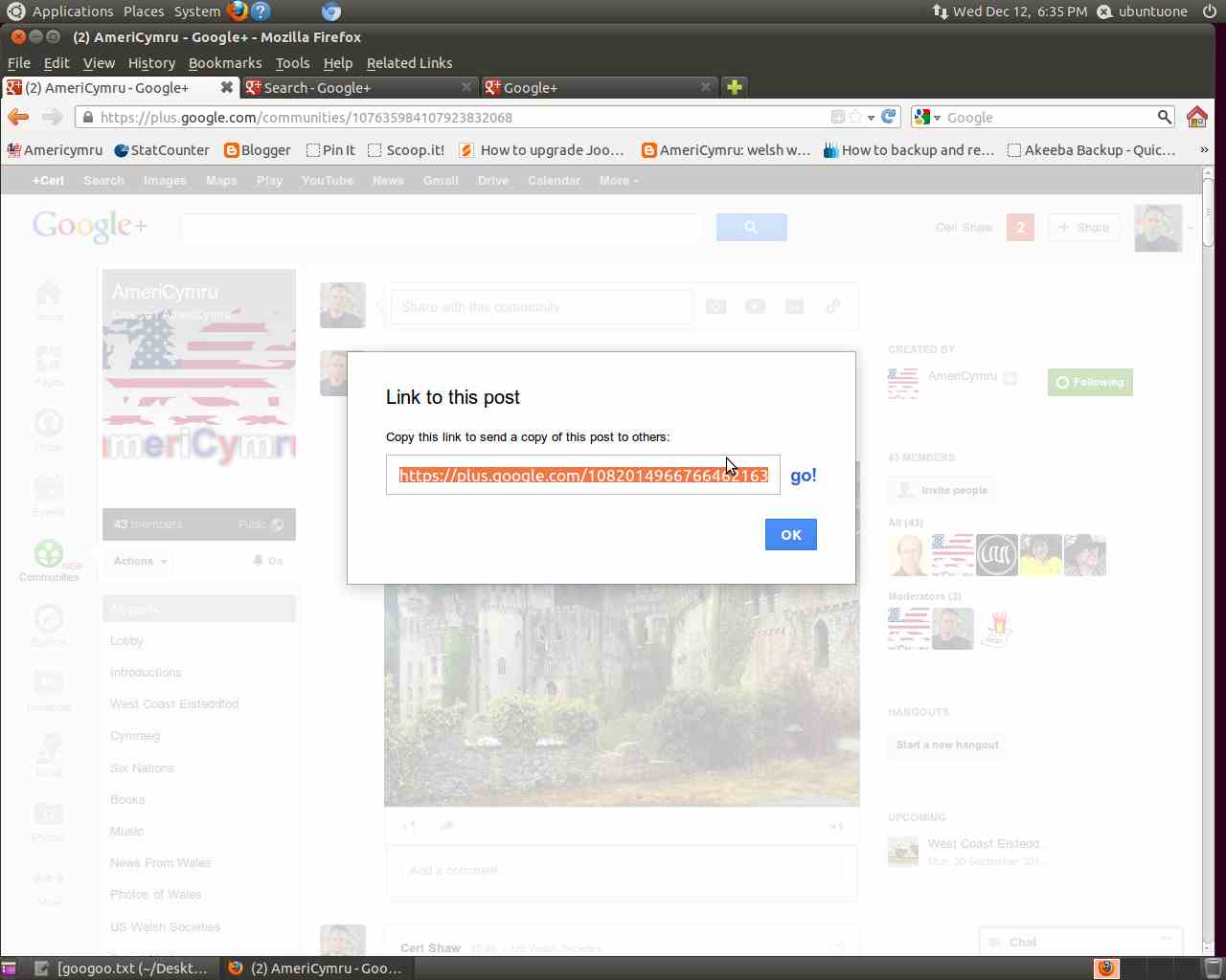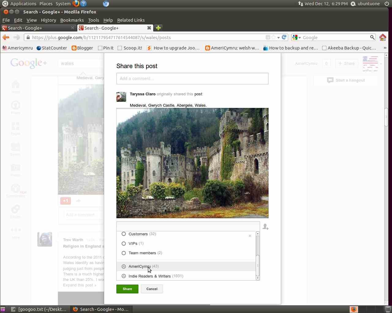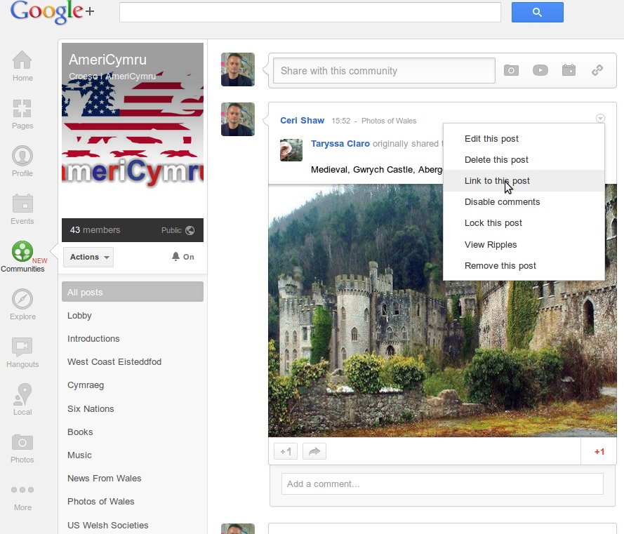 If you have a page or a profile on Google+ you can create a Community. A page based community is probably the better option if you have a product or website that you want to build around. The process of founding a community on Google+ is entirely intuitive so we're going to skip that and move on directly to sharing. How do you get some initial content in your Community feed and attract some new members? One way to go about this is to search G+ for relevant keywords and find an interesting related post somewhere on the network. In my case the topic is Wales and the Welsh 'diaspora'.