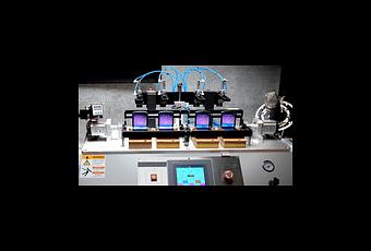 In a room that looks like a college black box theater, a series of lights are shone on a machine about 10 feet wide. There is a camera on a tripod that points at the machine and gives the entire room a strange TV show atmosphere. There are four Razr (2020) phones on the waist-high machine on the back. The device opens and closes all four telephones completely at the same time.