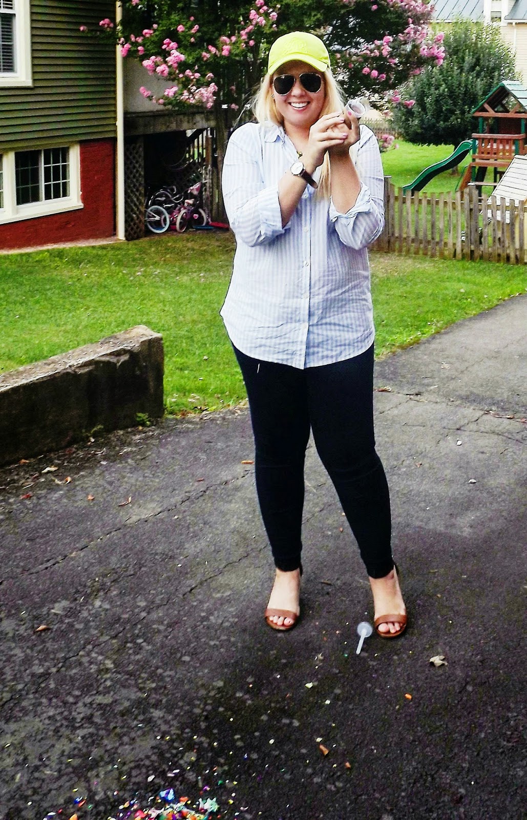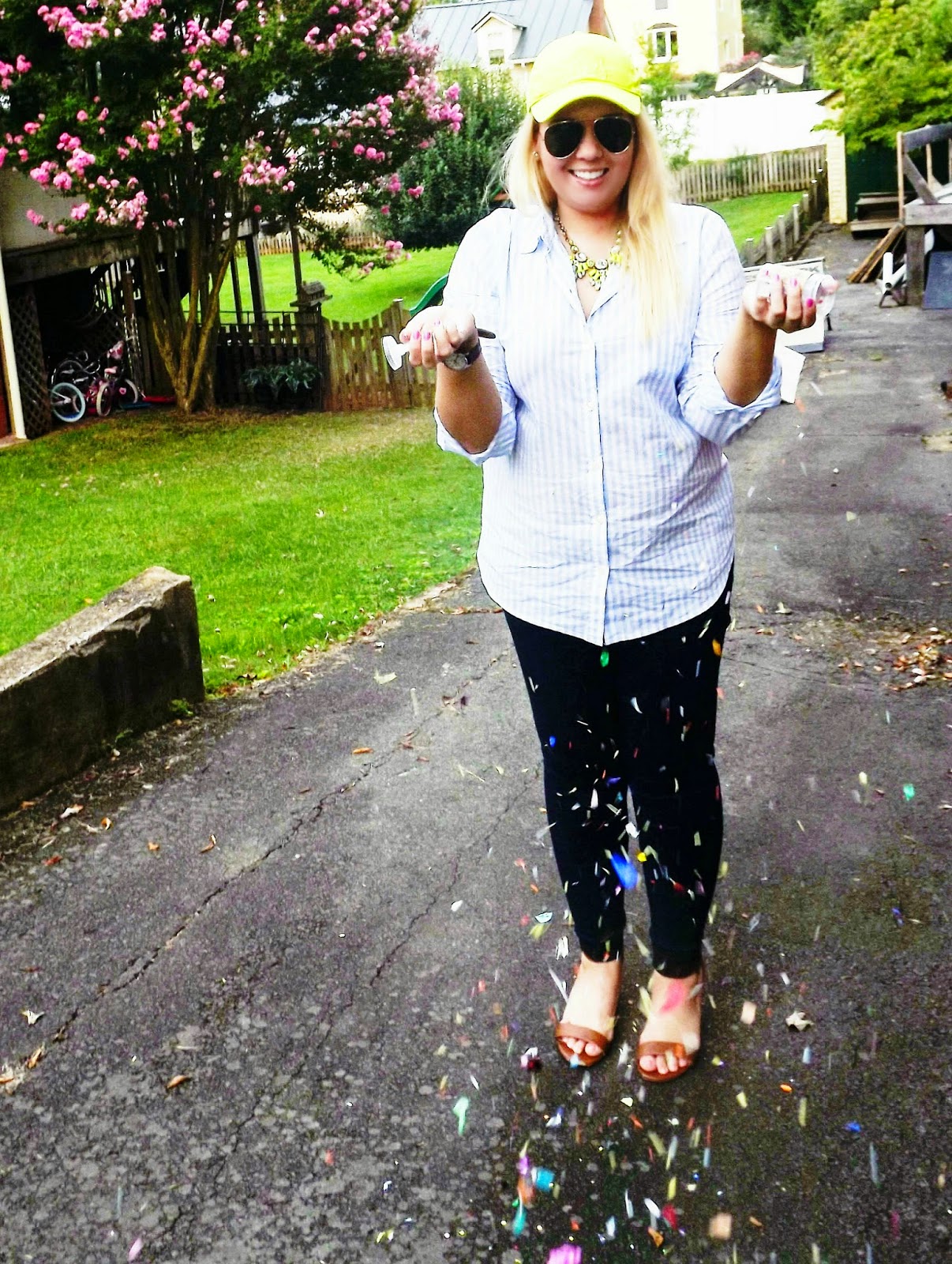 A favorite fall styling tip is to pair neons with neutrals. This light blue striped button down from Old Navy paired perfectly with some neons from J.Crew. The two polar opposites made a statement without overwhelming the outfit. The universal monogrammed baseball cap is one that I had been eyeing all season and had finally purchased it on the sale section of the J.Crew site. Let's be honest, the confetti just makes this post fun! xoBCC