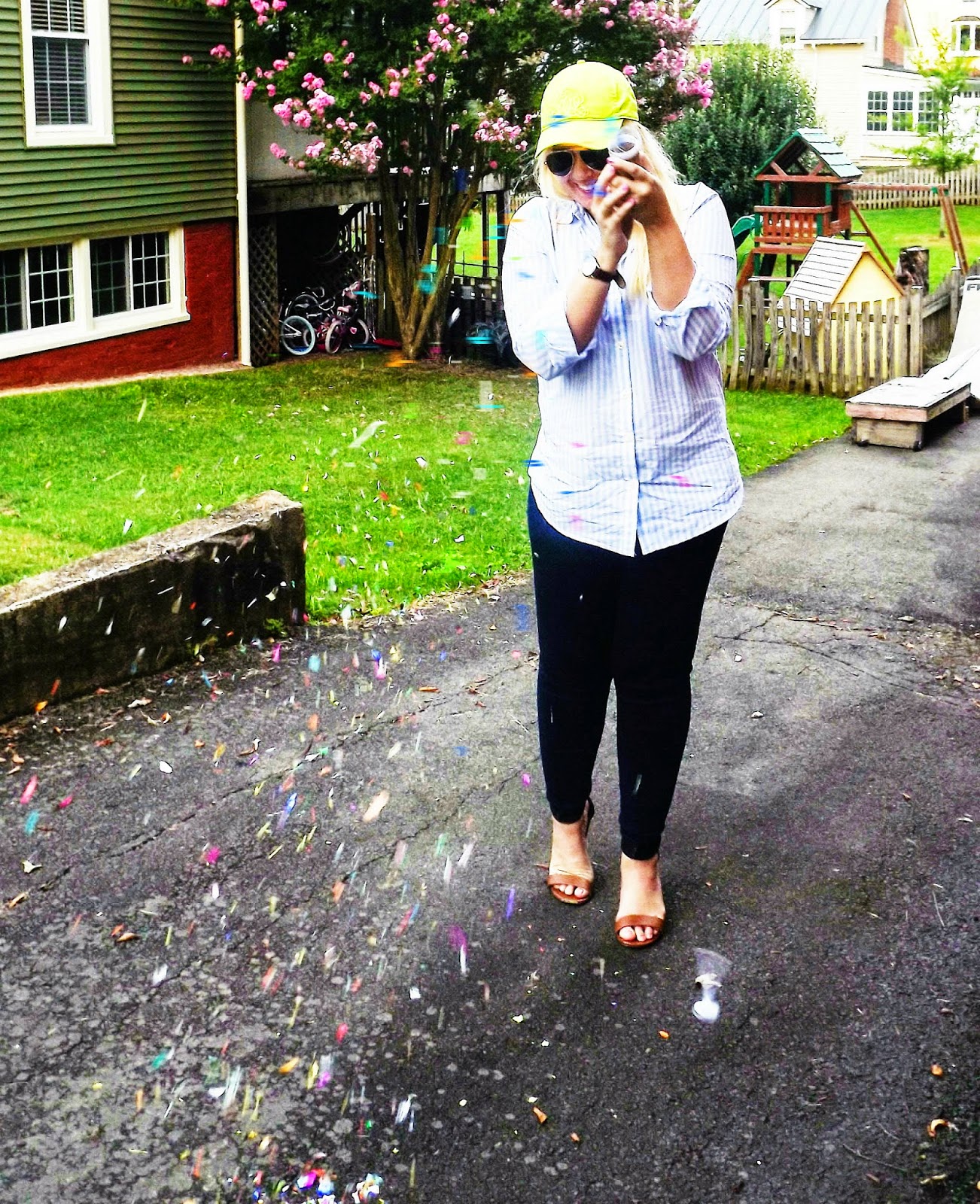 Outfit: Hat- J.Crew, Button Down- Old Navy, Skinnies- Old Navy, Shoes- Cato Fashions, Watch- Timex, Necklace- J.Crew, Sunnies- Boutique FindOne of my favorite finds from Harriet's General in my hometown were these awesome confetti push pops. They make for such a great little addition to an outfit post or whatever special thing you have going on in your life!
