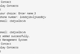 #include <stdio.h>#include <stdlib.h>#include <string.h>#define MAX_CONTACTS 100typedefstruct {char name[50]; char phone[20]; char email[50]; } Contact; Contact contacts[MAX_CONTACTS]; int numContacts = 0; voidaddContact() { Contact newContact; printf("Enter name: "); scanf("%s", newContact.name); printf("Enter phone number: "); scanf("%s", newContact.phone); printf("Enter email: "); scanf("%s", newContact.email); if (numContacts < MAX_CONTACTS) { contacts[numContacts] = newContact; numContacts++; printf("Contact added successfully.\n"); } else { printf("Cannot add contact. Maximum limit reached.\n"); } } voiddisplayContacts() { if (numContacts > 0) { printf("Contact List:\n"); for (int i = 0; i < numContacts; i++) { printf("Name: %s\n", contacts[i].name); printf("Phone: %s\n", contacts[i].phone); printf("Email: %s\n\n", contacts[i].email); } } else { printf("No contacts found.\n"); } } intmain() { int choice; while (1) { printf("Contact Management System\n"); printf("1. Add Contact\n"); printf("2. Display Contacts\n"); printf("3. Exit\n"); printf("Enter your choice: "); scanf("%d", &choice); switch (choice) { case1: addContact(); break; case2: displayContacts(); break; case3: printf("Exiting program. Goodbye!\n"); exit(0); default: printf("Invalid choice. Please try again.\n"); } } return0; }