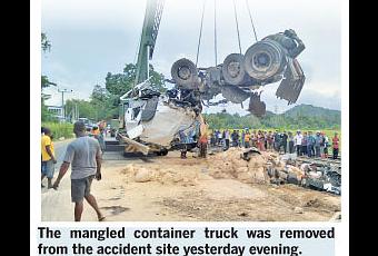 It is reported that the container truck entered the railway track carelessly while the railway crossing was closed. The trains running on the main line was halted temporarily due to the accident. Both the container truck and the train have sustained damages. Police are investigating the incident.