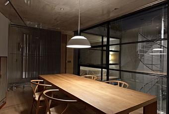 The house features a glass-enclosed air shaft running through its center to provide natural light while maintaining privacy from the outside.