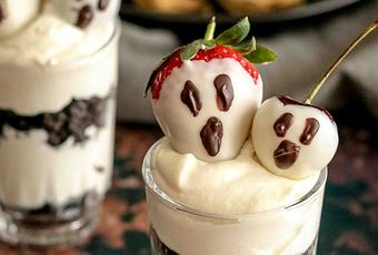 " />For a fruity finishing touch I added chocolate covered strawberry and cherry “ghosts” to the top of each pot. These mini cheesecakes are as fun to make and decorate as they are to eat and the perfect bite-sized mix of creamy and crunchy. Ideal for a party or a Halloween movie marathon on the couch. Prep them ahead of time, decorate and enjoy!