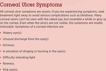 Not all infections progress to the point of developing into a corneal ulcer, however. But when the condition has turned into an ulcer, the symptoms include: