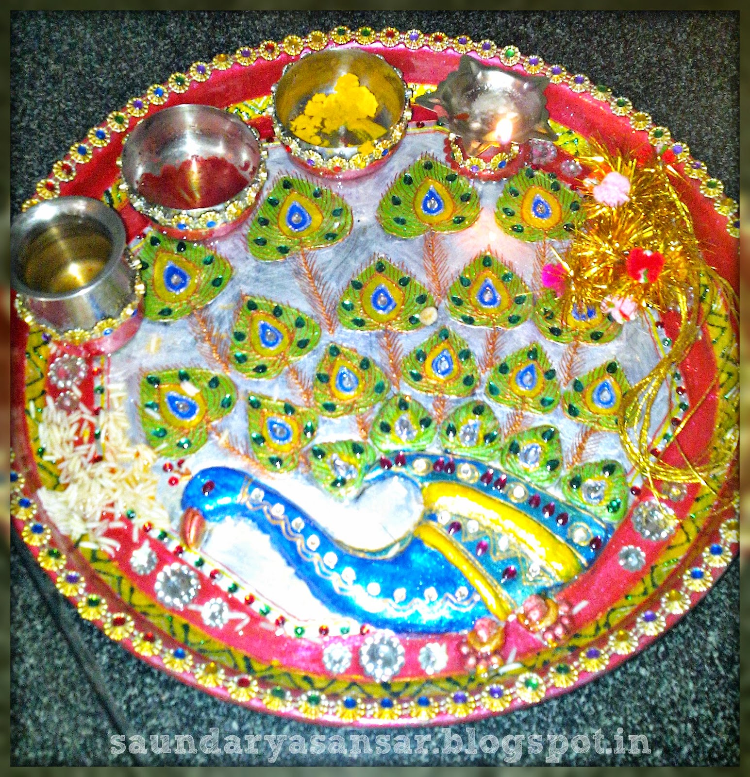 This was my Puja Thali for Karwa Chauth Puja. Its a Peacock Mural Thali which is washable and heat resistant too.Will come up with more Craft works....in this corner soon.