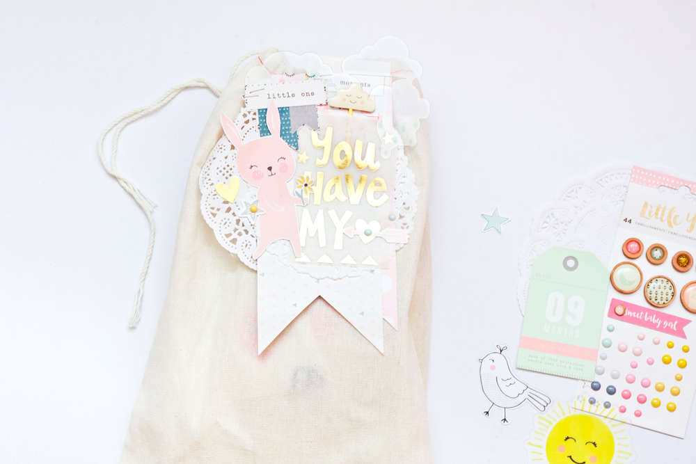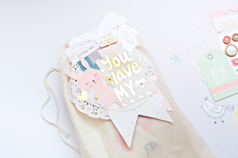 With packaging in mind, I wanted to give the muslin bag that filled with a baby dress a little fancy look. So I decided to create a packaging tag. It all started with two patterned papers that I cut into paper banner. And with that as my base, I layered paper doily and all the fun embellishments from the Little You collection.