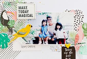 I really love creating layouts with clean lines and hence, this is a really quick & easy layout. I used a striped patterned paper on the left, placed the photo somewhere in the middle and composed all the fussy-cuts and all different dimension stickers around the photo. To add more layers, I used die-cuts.