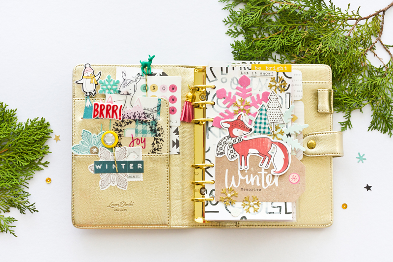 This page is pretty easy to put together. I cut the base to fit the planner. Then I used some gesso and covered up some of the words to create a subtle look to the page. Added a tag towards bottom of the page, a paper fox and added more fun paper ephemera to fill the gaps. Layering gives a fuller look to your page.