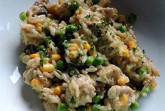 2 TBS butter1 pound raw turkey breast, cut into 1/2 inch chunks(alternately use 2 cups cooked poultry, diced)1 medium onion, peeled and diced2 cloves garlic, peeled and minced75g mushrooms, sliced35g plain flour (1/4 cup)3/4 tsp seasoning salt1/4 tsp black pepper1/4 tsp dried thyme480ml chicken stock (2 cups)240ml milk (1 cup)210g raw long grain rice (1 cup)150g each frozen peas and frozen corn niblets, thawed (1 cup each)