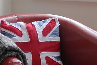 Hubs has a desk in the corner where there are two windows but the opposite corner (with a third window) has been a little bare since we moved in nearly two years ago. This is where we put the tree at Christmas but we have often talked of making more of this space. Inspired by Atlantic Shopping's Best of British campaign I decided to join in and create my own British themed corner for this room. A tub chair seemed the perfect solution for this small area and I chose a red chair from Atlantic Shopping for its neat shape and cheery color.I then set to styling the corner around this little tub chair and Atlantic Shopping's Best of British theme. Oh what fun! Out came a sweet Union Jack cushion cover made by our youngest at school last year (not perfectly made but that's why I love it), a favorite throw and a neat side table from Habitat (no longer available but can be found on Ebay).