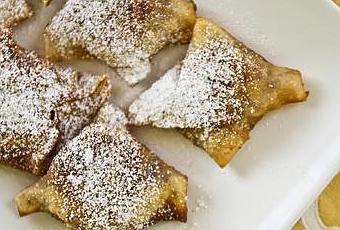 2. To make your wontons, drop a scant tablespoon of Biscoff butter into the center of the wrapper. Wet your fingers and moisten the entire perimeter of the wrapper. How you fold the wonton is up to you — I folded mine into a square to keep them flat for easy frying, but you can experiment until you find a method you like. To make a square, pinch the edges of two adjoining sides together, and fold them over. Then do the same with the opposite edges, making sure the Biscoff butter is securely sealed in — you don’t want its guts to explode everywhere!