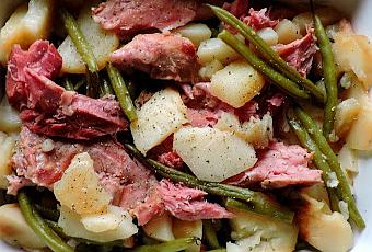 900g ham hock (2 pounds)240ml water (1 cup)3 large potatoes220g whole green beans, trimmed (1/2 pound)freshly ground black pepper