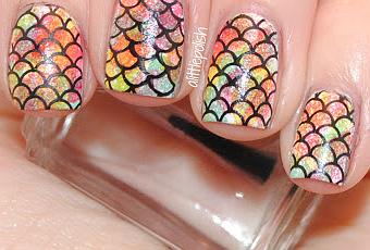 I sponged the red, yellow and green over a white base, and topped it with black stamping from Plate Mash-39. I accidentally made my middle nail an accent nail by stamping upside down, but it doesn't bother me too much and I bet some of you hadn't even noticed. After this mani I am feeling much more enthused to create my final mani on Thursday.