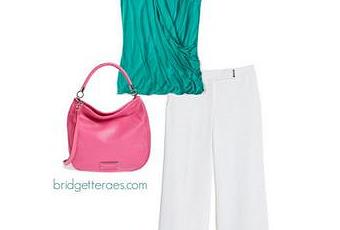 These pants are styled with a wrap top from Boden, printed wedges from Jessica Simpson, a pink handbag from Macy's and pink necklace from Stella & Dot.