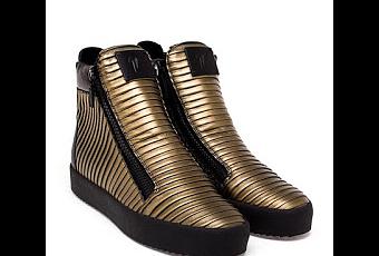 Take the luxe of a tux and give it a sporty high brow nod. That's exactly what the camp at Giuseppe Zanotti did with these Pleated Leather High Tops for Fall. The gold metallic upper is made of a premium leather that's been pleated and stitched for a cool almost corded effect. Completing the look are the patented Zanotti double zips on the elevated quarter, a polished back heel detail with a center back zip above it and a nice thick sturdy black rubber sole. Premium pleating indeed! Available now at Browns Fashion.
