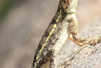 These little lizards were one of the most common animal lifeforms at Hampi. They blend into the rock quite well despite the broken white or yellow line of dots on their backs, which itself blends into the splotched pattern of the creature.