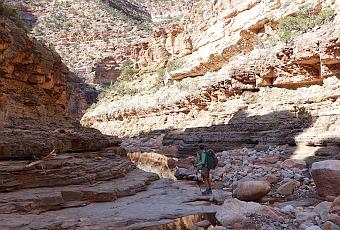 There was a nice breeze, we were often in the shade, and the temperature was just about perfect. There wasn't really a trail as the goal was to just hike up the canyon. We did have to cross the water at least 50 times to find safe ways to hike up stream, and it kept us at just under 2mi/hr pace, but it was really enjoyable. I liked the relaxed pace we were taking. I'm pretty darn proud of my ease with exposure on ledges as I hike more and more. Only a couple things froze me a bit today, but most of it was really fun and it's stuff I would have hesitated on in the past. Katherine got some action shots of me jumping down and hiking on ledges while she was on the opposite side of the canyon at one point.