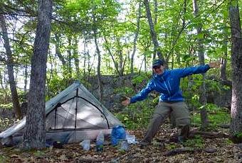 At the end of the day today, I reached a shelter with camping a bit early so I decided to risk it and hike on hoping to find a solo spot a mile or two north where the terrain looked flat. Of course that's when I entered a dense tunnel of rhododendrons and large rock boulders. I worried I'd made the right choice and then I came to the short side trail for Black Rock Overlook. Just to the side of the intersection there was a perfect spot for one tent. I went to the overlook nearby and it was nice and really windy. I could barely stand up and got a panoramic photo that is slightly blurry from the sun. Nice though!